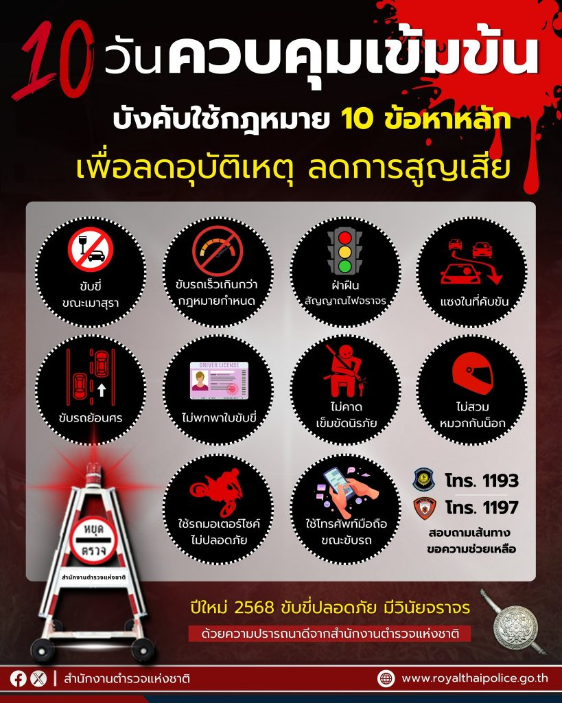 พร้อมบังคับใช้กฎหมายจราจรเข้มข้น ใน 10 ข้อหาหลัก คือ . 1. การขับขี่ขณะเมาสุรา 2. ขับรถเร็วเกินกว่ากฎหมายกำหนด 3. ฝ่าฝืนสัญญาณไฟจราจร 4. แซงในที่คับขัน 5. ขับรถย้อนศร 6. ไม่พกพาใบอนุญาตขับขี่ 7. ไม่คาดเข็ดขัดนิรภัย 8. ไม่สวมหมวกกันน็อก 9. ใช้มอเตอร์ไซค์ไม่ปลอดภัย 10. ใช้โทรศัพท์มือถือขณะขับรถ สอบถามเส้นทาง ขอความช่วยเหลือ โทร.1193 ตำรวจทางหลวง หรือ 1197 กองบังคับการตำรวจจราจร ( กทม.และปริมณฑล ) ด้วยความปรารถนาดีจาก #สำนักงานตำรวจแห่งชาติ #10วันควบคุมเข้มข้น #ปีใหม่2568